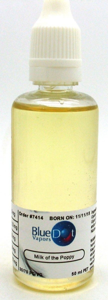 Blue Dot Vapors - Milk of the Poppy: Usually, you get what you pay for in the juice world. Cheap juices are usually simple, single flavor, and rarely ADVs. This is an exception in a big way. It's a creamy complex mix with a fruity undertone that we can't keep on the shelves. A big reason is the price: $10 for 50ml. That's crazy, I know. We only stock the 70/30 PG/VG ratio, which works great in both tanks and drippers. I promise this juice will blow you away.